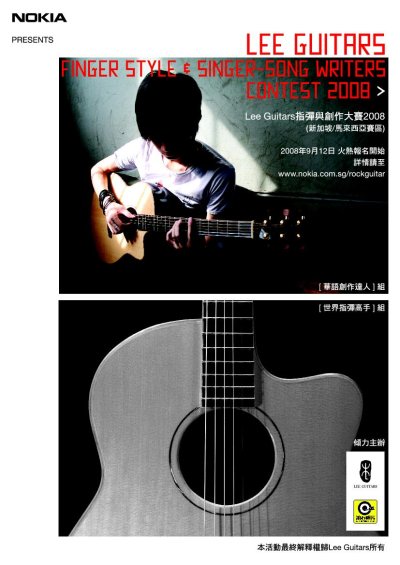 正如將於11月29日在新加坡室內體育館舉行的 [Lee Guitars All Star 新加坡演唱會] slogan所說:"一切都從吉他開始"。無法想象,如果在張震岳十七歲的那個下午,他沒有第一次拿起吉他;如果李宗盛的青澀年少,沒有第一次嘗試用簡單的四個和弦寫下一段旋律,他們的未來會是怎樣? 希望藉此鼓勵對吉他有濃厚興趣的朋友,拿起吉他, 創造未來! 本次比賽分為新馬、香港、台灣及中國內地四個賽區,比賽設"世界指彈高手"及"華語創作達人"兩個組別, 均以acoustic guitar(鋼線)呈現,以甄選指彈吉他演奏高手及華語創作型音樂人。所有參賽作品都必須是原創作品。首站新馬賽區之參賽者必須經過層層選拔、過關斬將, 每一組別最終在11月27號決賽日將產生各2名優勝者,所有4位優勝者將代表新馬賽區參加2009年北京的總決賽,往北京差旅費並由贊助商負責! 除了2009年北京總決賽外, 新馬賽區的4位優勝者也將可以於11月29日[Lee Guitars All Star 新加坡演唱會] 當天與品牌旗下的幾位重量級代言人周華健、五月天、蔡健雅、張震嶽及李宗盛同台獻唱,公開展示指彈炫技及秀出創作天賦。相信他們的精彩表現必將隨著比賽的火熱展開而成為萬眾矚目的新焦點!也相信Lee Guitars弘揚并推廣指彈藝術,發掘與鼓勵華語原創力量的真摯情懷必將給所有觀眾留下深切的感動! 別再遲疑, 馬上抓著這難得的機會, 在初選截止日 9月30日前到官方網站www.nokia.com.sg/rockguitar, 參閱相關參賽詳情, 並將作品upload上去, 爭取到北京參賽的榮耀, 並有機會贏得價值不斐的紀念版手製吉他, 也可能獲得李宗盛大師的一紙代言或簽約藝人合約, 與五月天等共同代言Lee Guitars! 更新时间: 2008年9月17日 10:34:49 AM