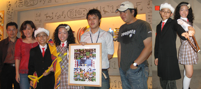 日期:19/05/2007 时间:12.00 pm 地点:双威海螺餐厅 等待了五年,姐弟组合优子惠飞终于带着他们的首张专辑<哈利波特魔术棒>正式进入乐坛,为大马中文乐坛注入新气息。 14岁的吴优子和12岁的吴惠飞分别是2002Astro儿童歌艺大赛的冠军人马。多才多艺的两人拥有非常丰富的舞台经验,是不少歌唱比赛以及演讲比赛的常胜军,也曾参与多部舞台剧的演出。 <哈利波特魔术棒>是彭学斌为优子惠飞量身制作的一张专辑。在记者会上,因身在马六甲而未能出席的彭学斌透过电话连线表示,这张专辑筹备了很久,他是针对优子惠飞的背景、兴趣和喜好进行考察后,才有这样的设计概念。因此,专辑多首作品的构思都是出自于优子惠飞喜爱的电影。 “优子惠飞很有才华,这张专辑结合了大家的用心,我们的乐坛需要更多健康的儿歌,并且继续发扬到全国各地。” 另外,大马滚石唱片董事经理陈宗逸也于记者会上送上飞机模型给优子惠飞,希望他们能具有以大马为基地的亚洲的航空一样的精神,飞向全世界。“我们的下个目标就是往中国大陆发片。”对于老板的栽培和厚爱,优子惠飞均表示非常感动,并说要一起加油。 MV导演王威胜则很有心思的将MV花絮用相架框起来,送给他们作纪念,借此希望他们能够记得每一个所经过的阶段,并视它为演艺生涯里很好的起点。 威胜指出,大马并没有很好的环境以及歌曲给小孩发展,他认为这张专辑是本地同类作品中表现较好的。而且,优子惠飞在拍摄MV时十分专业,令人敬佩。至于优子惠飞就觉得导演很有耐心和包容他们,同时也对NG的情况,感到不好意思。 更新时间: 2007年5月23日 12:33:24 PM