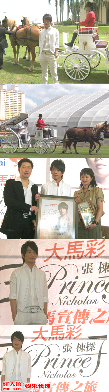 时间:2.30PM 地点:金马皇宫酒店 活动:张栋梁[王子]记者招待会 (吉隆坡新闻) 记者会开场前,赞助商与大马唱片公司安排了装扮一身白马王字造型的张栋梁乘坐马车到场。优于马儿见不惯闪光灯闪闪发光,突然闹情绪,拔蹄起跑饶多一圈回到会场。栋梁表示,其实坐在马上上并不恐怖,害怕是担心不知会被带到什么地方。 配合专辑概念栋梁说,”其实我一直都很亲民、随兴。大家还是称我为栋梁好了,[王子]这张专辑的概念而已,大家叫我"王子"总觉得好不习惯,觉得有种被束缚的感觉。“ 发片后一直逗留在台湾宣传的栋梁,忙碌至于他还常在网上游览大马媒体报导有关他的新闻。他说:”感谢大家一直都有报导我的新闻,这趟我是报着感恩的心态回来。虽然在台湾每天都过着忙碌的生活,,但看到这大家都很用新的做这张专辑,让我觉得有被重视,就算再累也感到高兴。“ 记者会前得知改版专辑在首天推出已出货5000张,栋梁表示.,很庆幸自己拥有一群尊重知识产权又愿意花钱购买专辑支持我的歌迷朋友,我对他们都很有信心。 上周五他在台北当任MICHAEL LEARNS TO ROCK (MLTR)演唱表演嘉宾。他说确实是个很难得的经验,也是他出道以来唱歌唱的最自然随兴的一次,"到彩排当天只和他们彩过一次就OK了,让我觉得有点不好意思想再开口要求多彩一次,他们真的很随兴很NICE,和他们合作感到很开心"。 问及年尾是否确定举办个人演唱会,栋梁坦言,其实自己,唱片公司及制作公司都觉得演唱会势在必行,可是因为场地的问题,导致演唱会仍遥遥无期,但不排除将延至明年,喜欢栋梁的朋友们,就得耐心的等待咯! -- JASMINE 好大牌报导 -- 丽君 超梦幻摄影 更新时间: 2007年7月11日 10:38:29 PM
