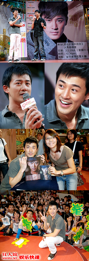日期:2008年1月2日 地点:金河广场大厅 (吉隆坡新闻) 香港无线电视当红小生林峯带着他的首张个人专辑《爱在记忆中找你》来到了金河广场和广大的“峯迷”见面,据现场调查,林峯的签唱会是中午12点30分才开始,但有些粉丝却在早上9点半就已经来到了现场霸好位子了,可见林峰的魅力是多么的利害啊! 在粉丝们的苦苦等候之下,林峯终于出场和大家见面了,他首先为粉丝们带来他专辑里的一首新歌《赤地转机》,台下的粉丝们除了尖叫林锋的名字之外,还卖力的跟着林峯一起唱了起来,让林峰好不高兴,一曲唱罢,主持人问林峰什么时候会再发第二张专辑,林峯表示其实已经是在开始录歌了,但为了要专辑做的更好,所以还是要粉丝们再耐心的等一些些时间。 接着,林峯再带来一首专辑里的主打歌《爱在记忆中找你》,实力的唱工,让林峰一再的证明了他除了可以演戏之外,唱歌他也一样是非常了得的。 - 特约Guyuno 摄影+报导 更新时间: 2008年2月12日 2:01:29 PM