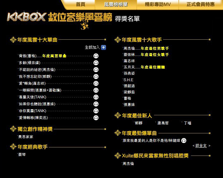 (台北新闻)2007第三届KKBOX数位音乐风云榜将于1月31日线上揭晓,林健辉凭马来西亚创作曲“原来我最爱的人是你不是他”获得年度最劲爆单曲。 到台湾参加超级星光大道踢馆PK赛一战成名的林健辉,被台湾媒体誉为马来魔。在与曾沛慈2度同灯同分之后,凭一首原创曲“原来我最爱的人是你不是他”击败曾沛慈。这歌也成为了台湾网友的最爱。 “原来我最爱的人是你不是他”是林健辉与温力铭共同创作的歌曲,这首歌曾经入围2006年娱协奖。 这是林健辉第2次以马来西亚创作歌曲取得好成绩,去年12月他在中国以创作歌曲《梦想起飞》登上SMG中国移动无线音乐排行榜第108期销量榜冠军,销量达35万7千2百60。 KKBOX数位音乐风云榜自开台至今已迈入第三届,深受各大唱片公司及网友们的重视。数位音乐风云榜各类奖项之得奖名单,因透过KKBOX 450万会员共同点播所产生,深具市场指标性意义。 更新时间: 2008年2月14日 3:27:48 PM