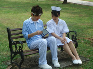 ![]() 日前,林健辉出现在医院,头绑纱布在护士小姐的扶持下到医院的小公园乘凉。许多在场的公众看到了这一幕,都吓了一跳以为说林健辉出车祸受伤了,有些人还跑前去慰问他一番。 原来,是林健辉为拍摄歌曲”快乐王子“MV应故事的需要而在医院扮起病人。当天下午是因为导演放休息,健辉就和扮演护士的沈诗芳到公园去小休一会。 "快乐王子”是健辉左边EP的一首慢版歌曲,虽然不是主打歌,但却是歌迷询问度最高的歌曲。在众歌迷的要求下,健辉向公司坚持一定要为这首歌拍摄一个MV。 MV由一群对于马来西亚中文MV拍摄非常有热诚的年轻朋友负责,故事是讲述健辉跟一个盲女孩一直错过的爱情,非常的感人。 拍MV的过程中,最让健辉印象深刻的是女主角的演技。为培养女主角掉眼泪的情绪,健辉开始讲一个非常凄惨的故事来酝酿眼泪,才开始第一句对白女主角的眼泪已经如豆的滴下来了,令健辉看了非常的折服。 “快乐王子”MV将随“右边的林健辉”送出。预知MV的内容及健辉的演绎,就必须要留意电视台及卡拉OK的播映时间罗! 更新时间: 2006年3月18日 2:14:26 PM