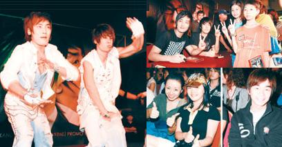 不晓得这批死忠粉丝是否为了贴身追踪偶像,北上南下舟车劳累,抑或是与舞台有段距离,在KV亮相之前,热情略嫌不足,主持人作出呼吁,高喊KV的名字,大家合作先喊“Vanness”,又喊“Kangta”,随即又有一批粉丝喊出“安七炫”,现场各有各叫,乱成一堆,结果大家的热力在KV以《Scandal》登场飙歌飙舞前,总算完全燃放High起来,让KV开心的连声道谢!Kangta还不时吐出字正腔圆的“谢谢”、“大家好”、“一起跳”等中文,让台下粉丝一再发出尖叫。 前一晚直奔槟城便深深感受大马粉丝热情的Kangta,周日晚上依然不忘大赞吉隆坡粉丝的表现一点也不逊槟城,Vanness则说∶“大马粉丝很热情也有点腼腆呢!” KV在这场由CMG与绝对娱乐联手打造的第二场大马签唱会上,共献唱了4首歌曲,两人以中韩双语的《勇气》结束演唱部份,本地歌手林健辉、何志健、M Girls的庄群施及王雪晶也前来捧场。 更新时间: 2006年9月7日 3:40:09 PM
