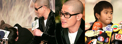 ![]() 郭富城和吴景滔以《父子》夺得金马奖最佳男主角与男配角,颁奖典礼后两人就未再见面。这次在台聚首,“父子俩”十分开心。郭富城今天带着电影《父子》里的儿子吴景滔来台,九岁的吴景滔看到闪烁不停的镁光灯,又不知如何回答问题,当场吓哭。 郭富城自嘲说:“大概是想到我在戏里打他的情景”,并对吴景滔说:“爸爸不会打你。”但吴景滔仍是啜泣不已,工作人员只好带他离开会场,留下郭富城独撑大局。当媒体问吴景滔会不会害怕戏里对他又打又骂的郭富城时,他说:“害怕”;接着记者再问,看到戏外的郭富城会不会想成戏里的爸爸时,他犹豫了一下,摇摇头,随即头低了下去。不久就传出啜泣声,大家才发现原来小景滔哭了。郭富城见状说:“大概想到我在戏里打他的情景就哭了”,并拍拍小景滔的肩说:“爸爸不会打你”。但吴景滔仍是低着头,不断抽噎。工作人员只好赶紧带他离开会场,回饭店房间休息。十分疼惜吴景滔的郭富城打圆场说,其实吴景滔在片场完全不怕镜头,而且一上戏就可以立刻进入状况;今天大概是看到现场太多陌生人,又不知如何回答问题才吓哭了。他直说吴景滔其实是个很有天份的小演员,得到金马奖肯定是实至名归。 郭富城、吴景滔“父子”记者会,却上演“虐童”戏外戏,9岁吴景滔受不了媒体大阵仗,在台上大哭,记者会因此中断5分钟。郭富城安抚小朋友之余,也透露5年后当爸爸的心愿,和名模熊黛林的交往显然十分顺利。 吴景滔以“父子”纯真演出打动人心,勇夺金马奖最年轻的男配角奖,戏外的他却十分怕生,昨天他和郭富城在台上,主持人问第三个问题时,吴景滔就低下头,等哭到背部抽蓄,郭富城才发现,赶紧拍拍他,摄影记者全冲过来拍摄,记者会因此中断。 有人上台把吴景滔带下台,摄影机又立刻弃郭天王,纷纷跟拍吴景滔,主持人请大家饶了小朋友,免得吓坏他。郭富城在台上化解尴尬说,吴景滔戏外怕生,拍电影却完全不怕镜头压力,天生该吃这行饭,拍完“父子”让他体认到,生儿育女很重要,他打算5年后生小孩。 郭天王结婚生子计划提前,是不是出现人选 名模熊黛林是人选吗“我和熊黛林不错啊,她人满好,性格不错,不过人与人之间,不能肯定说现在、未来如何。我的异性朋友很多。”郭富城表示,这5年他会努力工作,还想做音乐剧。 台湾首富郭台铭昨天没在“父子”记者会露面,郭富城因在零下10℃拍“白银帝国”而感冒,提到郭台铭前阵子有去山西探班,两人有没有再谈合作拍片的事 郭富城表示,郭大老板说话算话,“还要谈吗 他说过了就算,他说过的每个字,都在空气中打印好了。” 山水电影老板之一是郭台铭儿子郭守正,员工对外却被下封口令,不得提到郭台铭三个字。“父子”记者会前,山水员工更“恐吓”媒体,如问题提到郭台铭,他们就会出来打断。台湾记者也不是省油的灯,“父子”记者会中依然有人问郭富城对郭台铭的印象如何 主持人立刻接话打断,郭富城仍继续回答:“他风度翩翩,亲切友善,是个很有心的人。” 更新时间: 2007年1月8日 12:40:01 AM