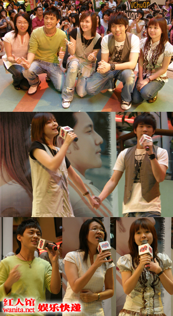 日期:2007年6月24日 时间:上午1点 地点:金河广场底层 (吉隆坡新闻) 陈威全与王蓝茵一起到台湾受训,不禁让外界怀疑两人是否会日久生情。日前在活动上,两人更首次在台上手牵手演绎“中间” 。随后要出场访问他们的主持人,还心疼表示其实不想这么快出来打扰两人在台上搞暧昧。 配合<< 想飞电视原声带 >>的推出,参与原声带的肋骨音乐旗下歌手包括陈威全,王蓝茵,陈诗慧,王熙强及黄慧雯都出席与金河广场举行的首场签唱会。 首先是打头阵的是师姐王蓝茵,她演绎<< 想飞 >>偶像剧的主题曲“乘风” ,很明显受训回来瘦了一圈的她,虽然在台上话不多,演绎歌曲时候的投入却不必其他音乐人逊色。个子小小,让人觉得弱不禁风的诗慧,在台上带来“欠你的幸福” ,她透露自己常通过看偶像剧及跟朋友聊心事来培养情绪演绎歌曲。对于原声带中的表现,诗慧觉得还蛮满意。 之前担任过WHY迷你演唱会的王熙强,这次同样带来“等待” 这首歌曲。这次显见舞台整体表现有进步的熙强表示,原声带中所有歌曲都是为<< 想飞 >>每个剧情量身定作。至于“等待” ,他是以男主角等待女主角回应时的心情来演绎。还未录音之前,熙强已经唱过很多遍,直到真正进入录音室时,才被制作人告知有很多暇疵。外表看似害羞的他,出乎意料的在台上表示,“如果有一个女生喜欢等待的话,我会等他一辈子” 。 创作才女黄慧雯,今次并非首次参与原声带的歌曲。之前在<< 恶作剧之吻 >>电视原声带中,她已交出“遇到” ,这次<< 想飞电视原声带 >>一样收录了她的创作“很久以前” 。有才女之称的慧雯,曾经在短短20分钟之内写好一首歌,让现场主持人佩服不已。 台风越来越稳健的师兄陈威全,现场演绎“中途转机” 。虽说首次尝试演绎这么高难度的歌曲,新秀出身的威全依然把歌曲演绎得淋淋尽致。这么巧,“中途转机” 的填词人正是当天的主持人子珊,威全不忘感谢她及谱曲人把歌写得这么好,让他每次都可以很投入的演绎。 演唱部分在威全及蓝茵合唱“中间” 下结束。购买原声带的歌迷排队给予众歌手签名,为签唱会画下句点。 - 丽君 超实力派 报导 - Jasmine及特约Ivy摄影 更新时间: 2007年6月27日 11:16:41 PM