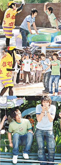 (香港新闻) 汪东城和炎亚纶两位飞轮海成员,昨天趁大暑到香港迪斯尼拍摄宣传短片,他们跟卡通公仔大玩湿身水战,又在场内大秀舞技及向Fans送飞吻,令现场逾百Fans神魂颠倒!