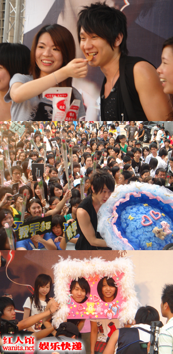 尽管近期正面临有史以来最强的台风,导致之前所有的签唱会被逼取消。但台北的这场签唱会却碰巧台风经已告一段落,最后还是如期举行。而数位大马歌迷也是冒着台风的危险而飞来台北见俊JJ,另他感动不已。同时,贴心的歌迷们知道鸡仔饼及香饼是JJ来到马来西亚时最喜欢及比定吃的食物时就特地买来送给他,其中一位女歌迷更将鸡仔饼的包装开掉并抽出一块喂俊杰吃,令现场所有的女歌迷羡慕不已! 难得顺利举行签唱会,当然少不了献唱新专辑的歌曲,开场歌曲就带来了充满Beat Box味道的 -- 海螺音乐新闻及照片提供 更新时间: 2007年8月29日 1:18:41 AM